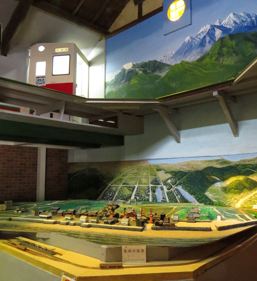 1階は、亀崎の町を走るJR武豊線(Nゲージ)、2階は日本アルプスの名峰を中心とした日本の風景の中を列車(HOゲージ)が走りまわります。